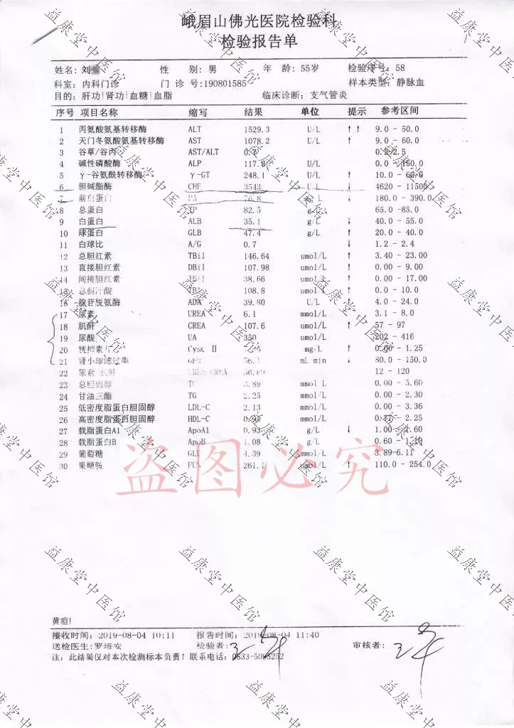 采用本馆纯天然中草药配方治疗两个月后,刘先生于2019年11月5日到乐山市中医医院复查,各项指标基本恢复正常,达到预期效果。