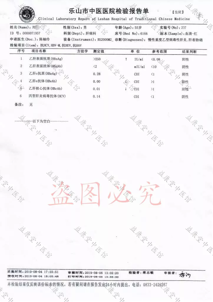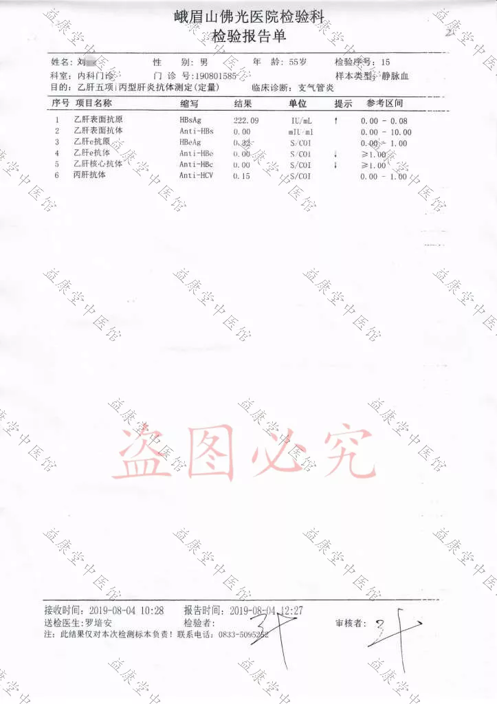 时隔一年多,患者刘先生乙肝表面抗原、乙肝e抗体、乙肝核心抗体阳性、肝硬化失代偿期,当初华西医院讲恐怕换肝的机会都没有,患者于2019年8月23日出院后服用我馆中草药4个月中药,检查报告结果如下: