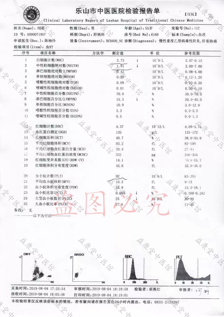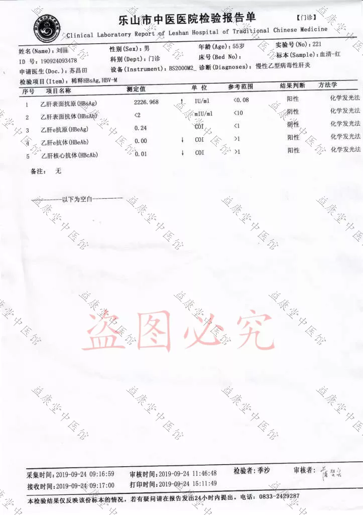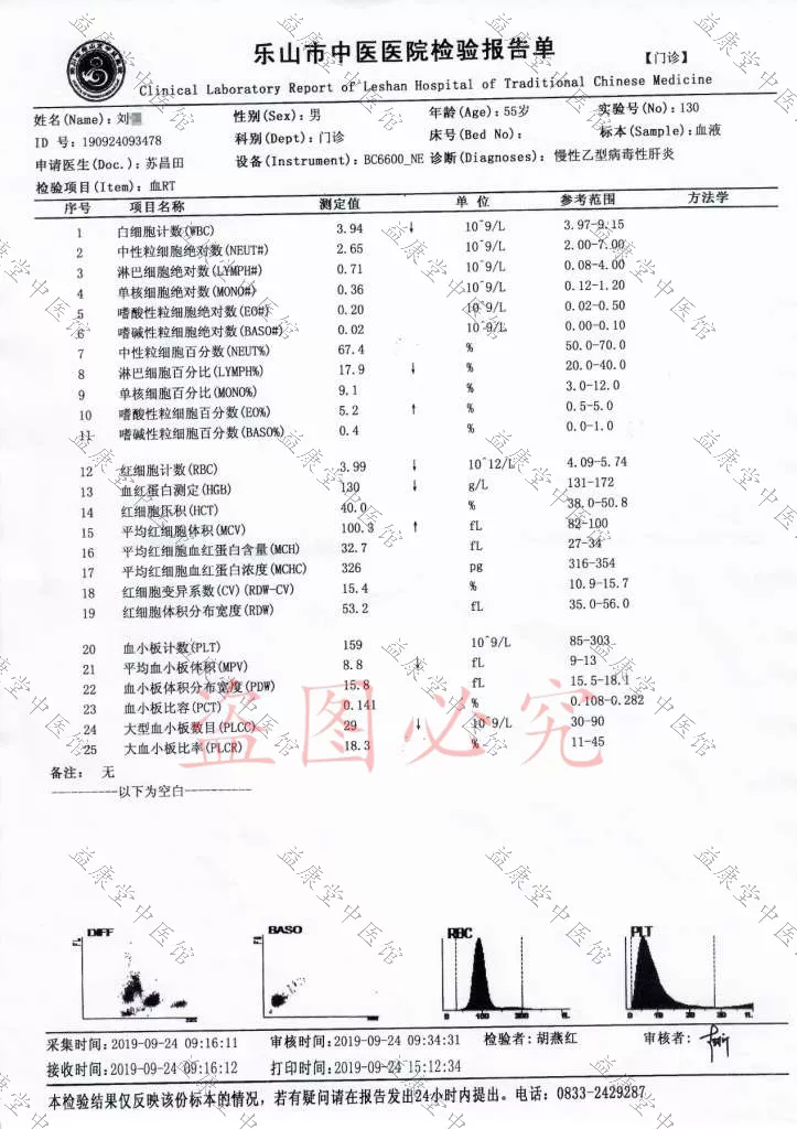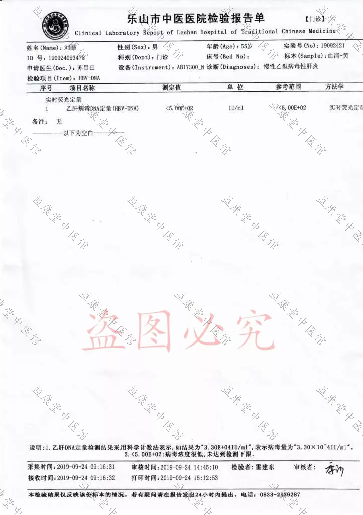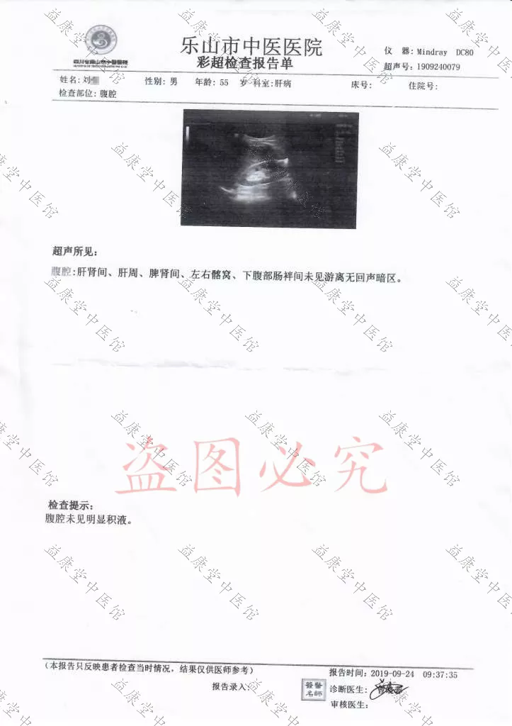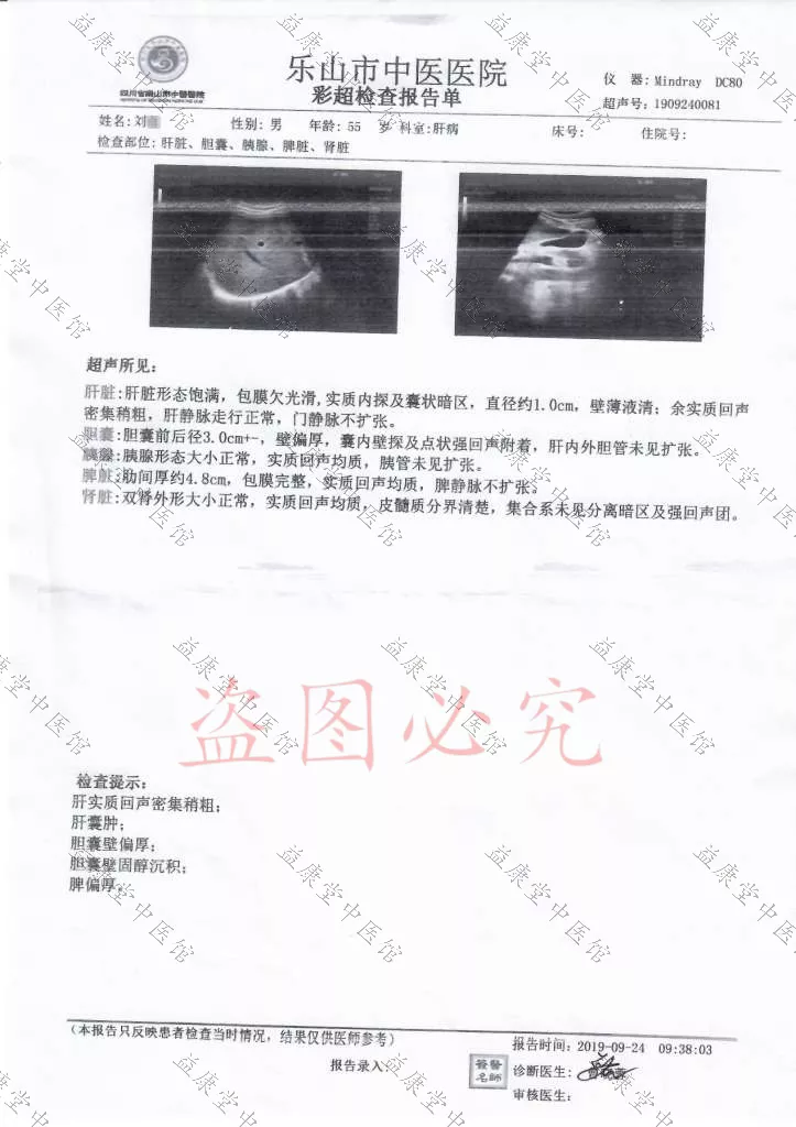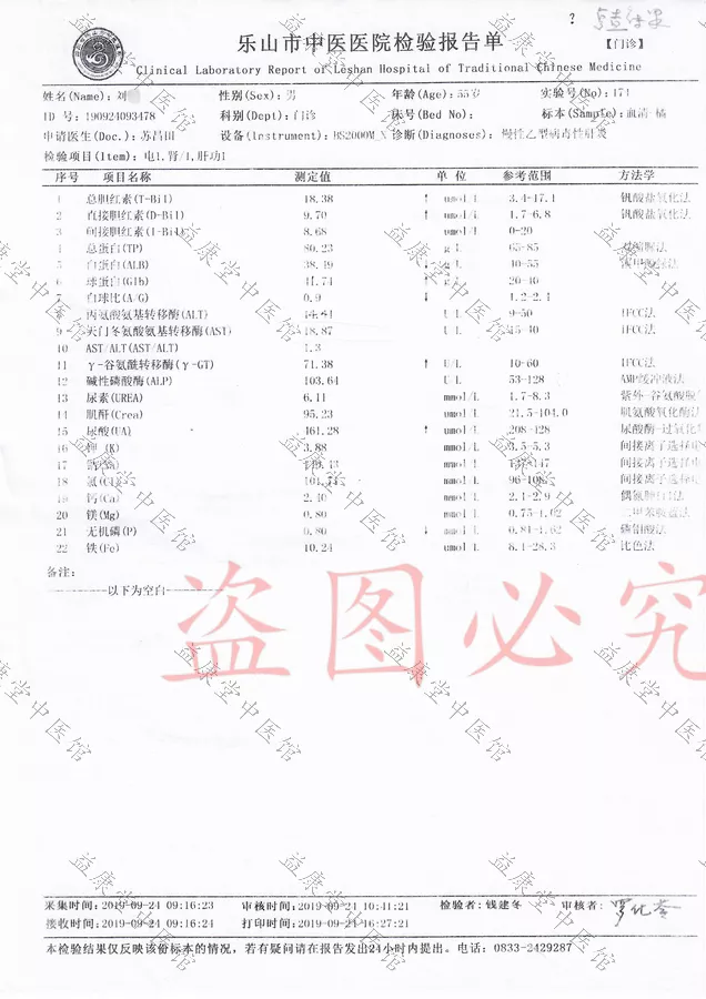 采用本馆纯天然中草药配方治疗一个月后,刘先生于2019年9月24日到乐山市中医医院复查,各项指标逐步恢复正常,达到预期效果。