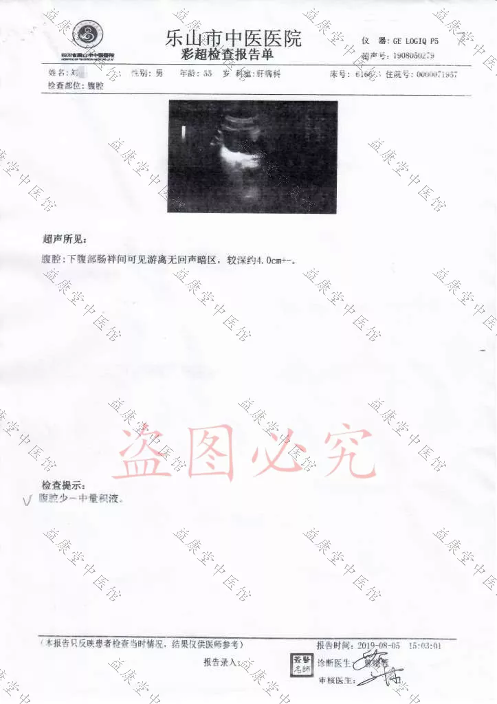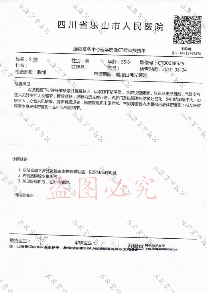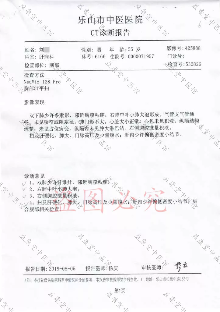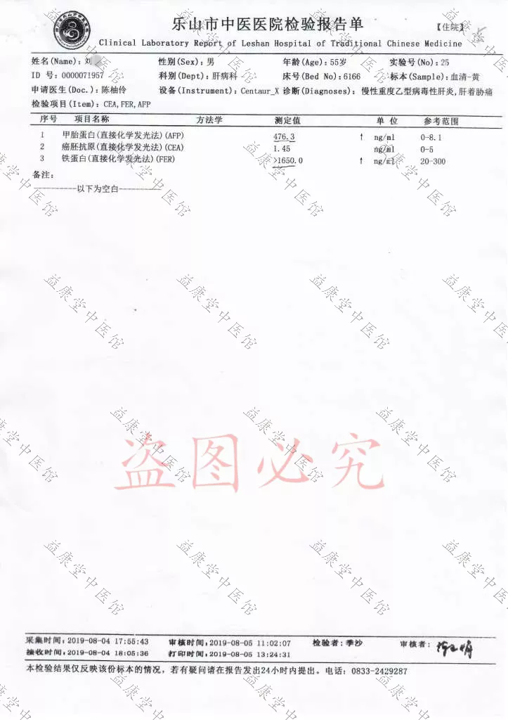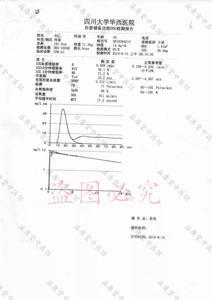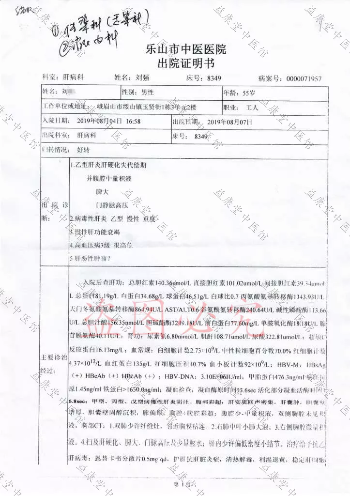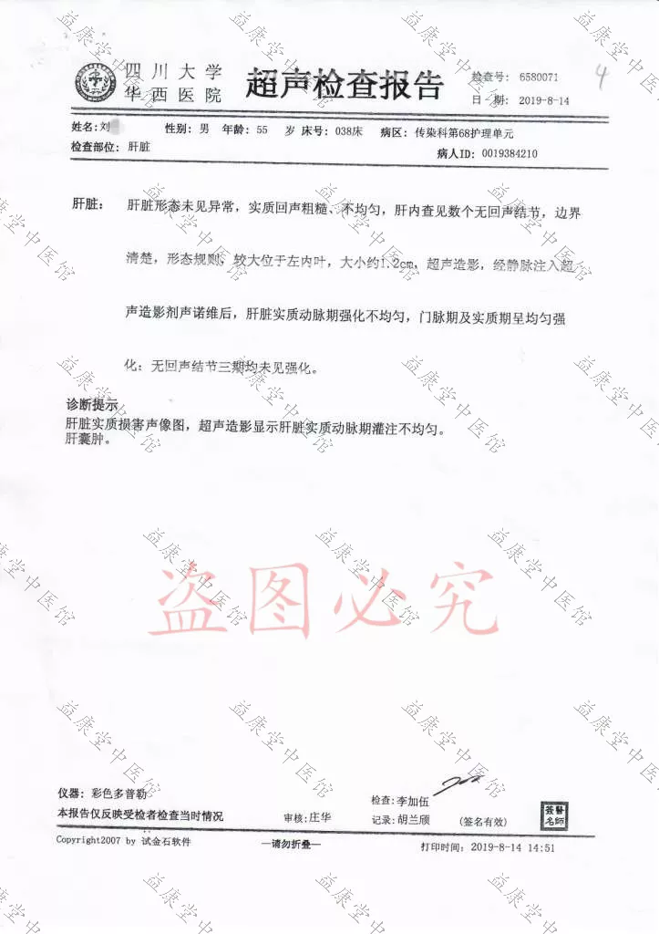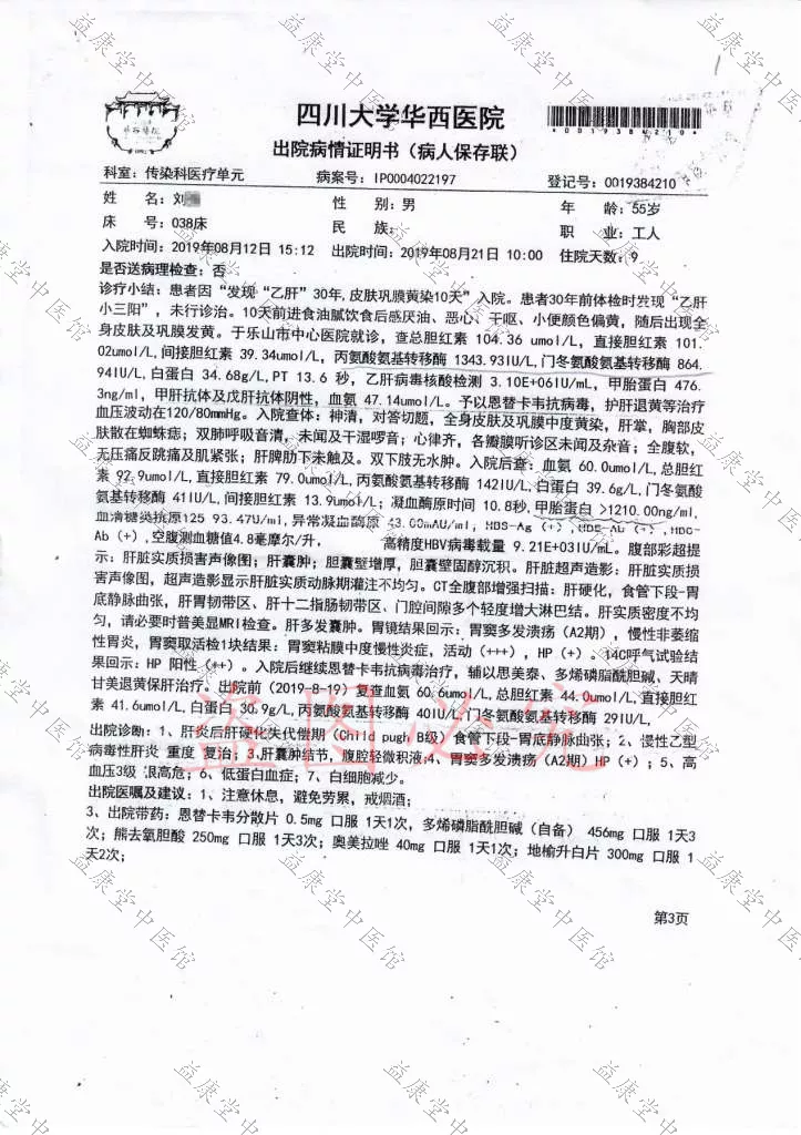 刘先生于2019年8月21日在四川大学华西医院出院后,于2019年8月23日接受益康堂中医馆纯中药治疗。
