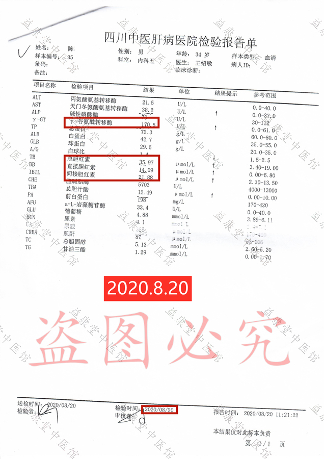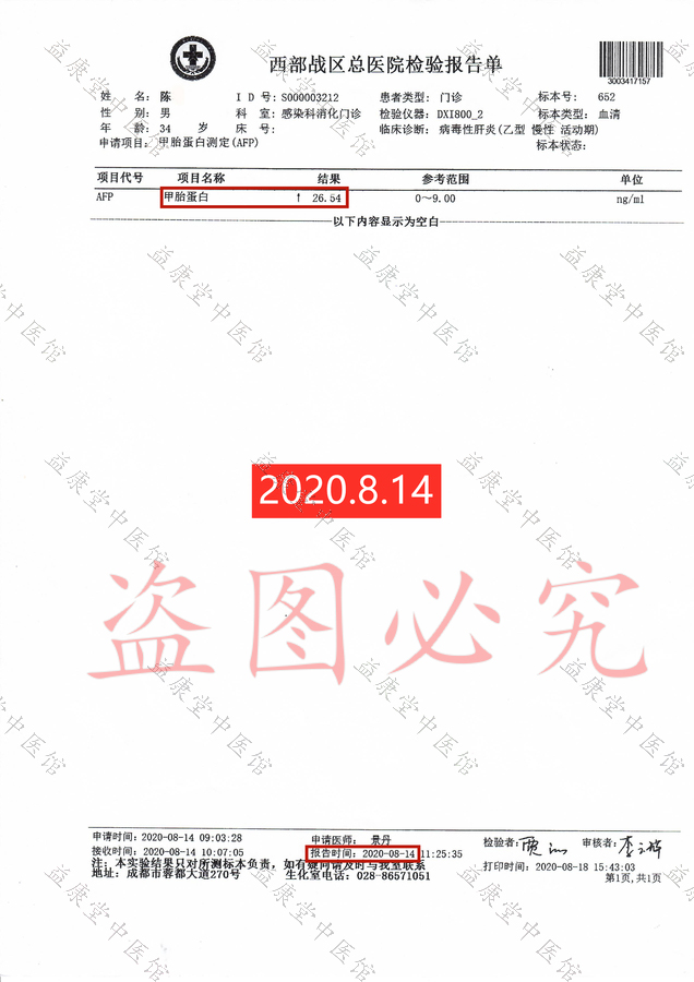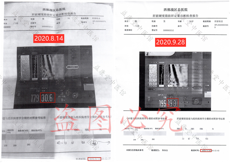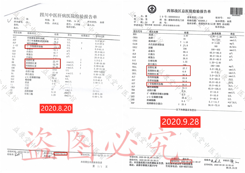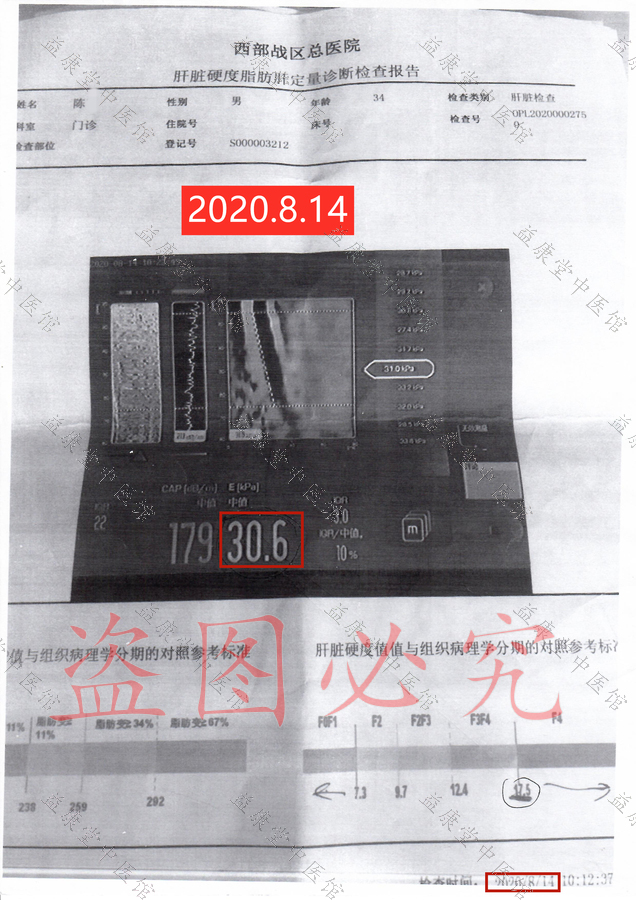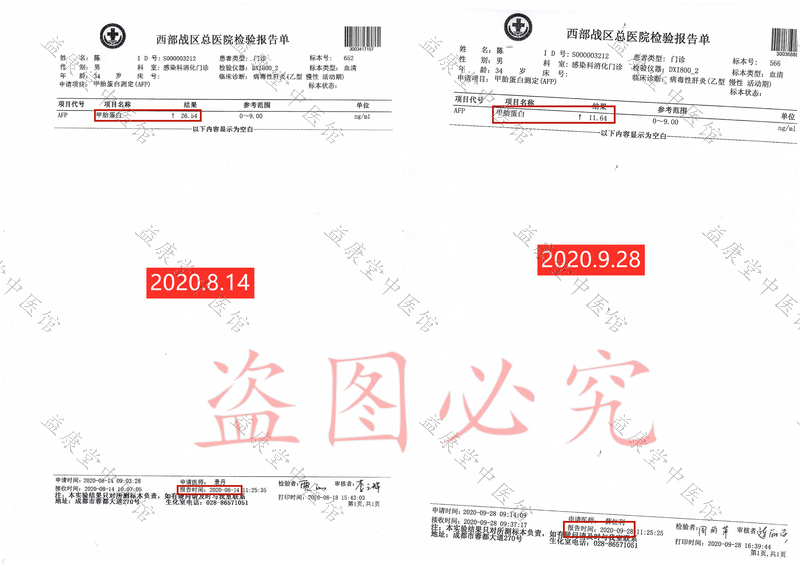 患者服用益康堂中医馆1个月中药后,于2020年9月28日前往医院复查各项指标,肝脏硬度从30.6降为19.3,甲胎蛋白从26.54降为11.64(正常范围0-9.00),γ谷氨酰转肽酶从170.5降为56.0(正常范围10.0-60.0),各项指标明显好转,对比用药前后指标,患者发自内心的喜悦难以言表。