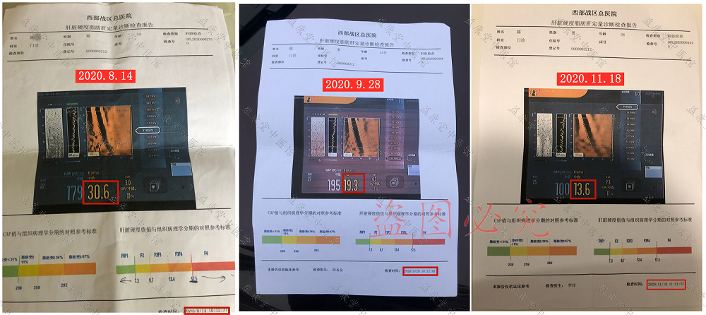 患者服用益康堂中医馆2个半月中药后,于2020年11月18日前往医院复查各项指标,肝脏硬度从8月14日的30.6,9月28日降到19.3,11月18日再降为13.6,各项指标明显好转,对比用药前后指标,患者发自内心的喜悦难以言表。