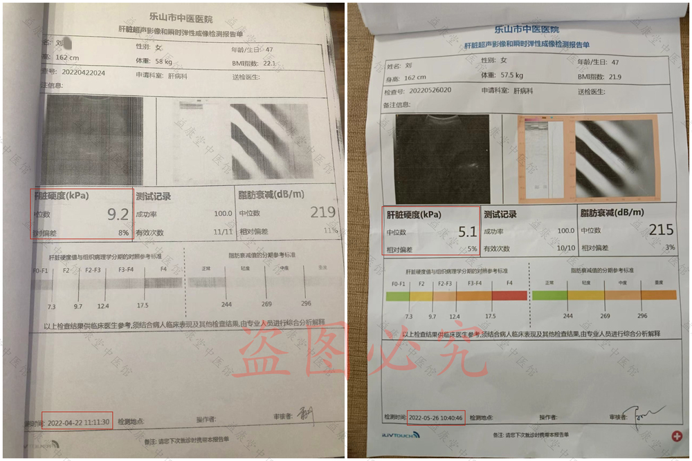 患者于2022年4月26日到我馆就诊,使用中草药、祖传秘方一个月后,肝脏超声影像和瞬时弹性成像检测报告单对比显示如下。