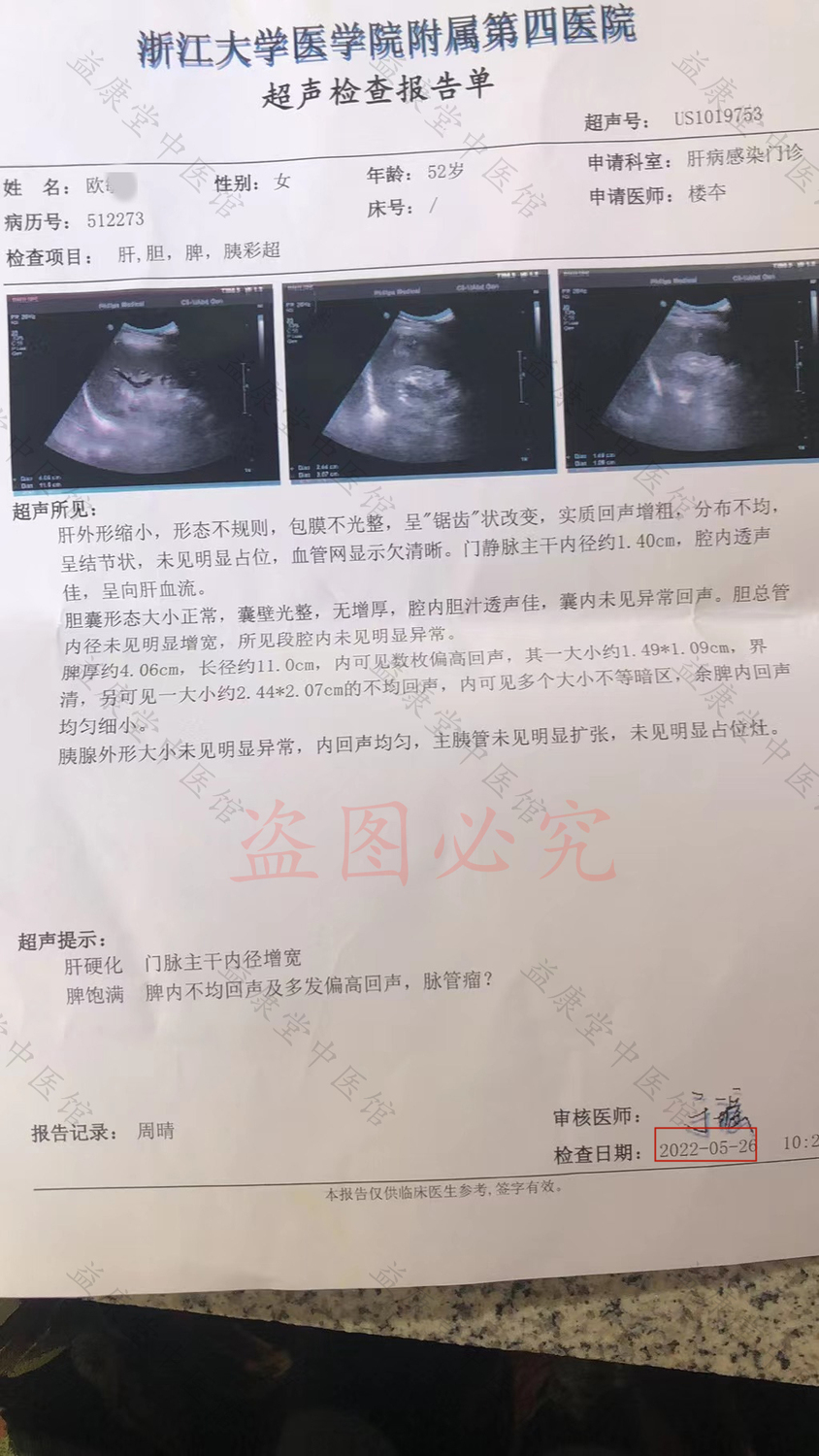 因右上腹隐胀隐痛,胃脘、腹部偶胀气,于2022年5月26日超声检查:肝外形缩小,形态不规则,包膜不完整,呈“锯齿”状改变……门静脉内径约1.40cm。