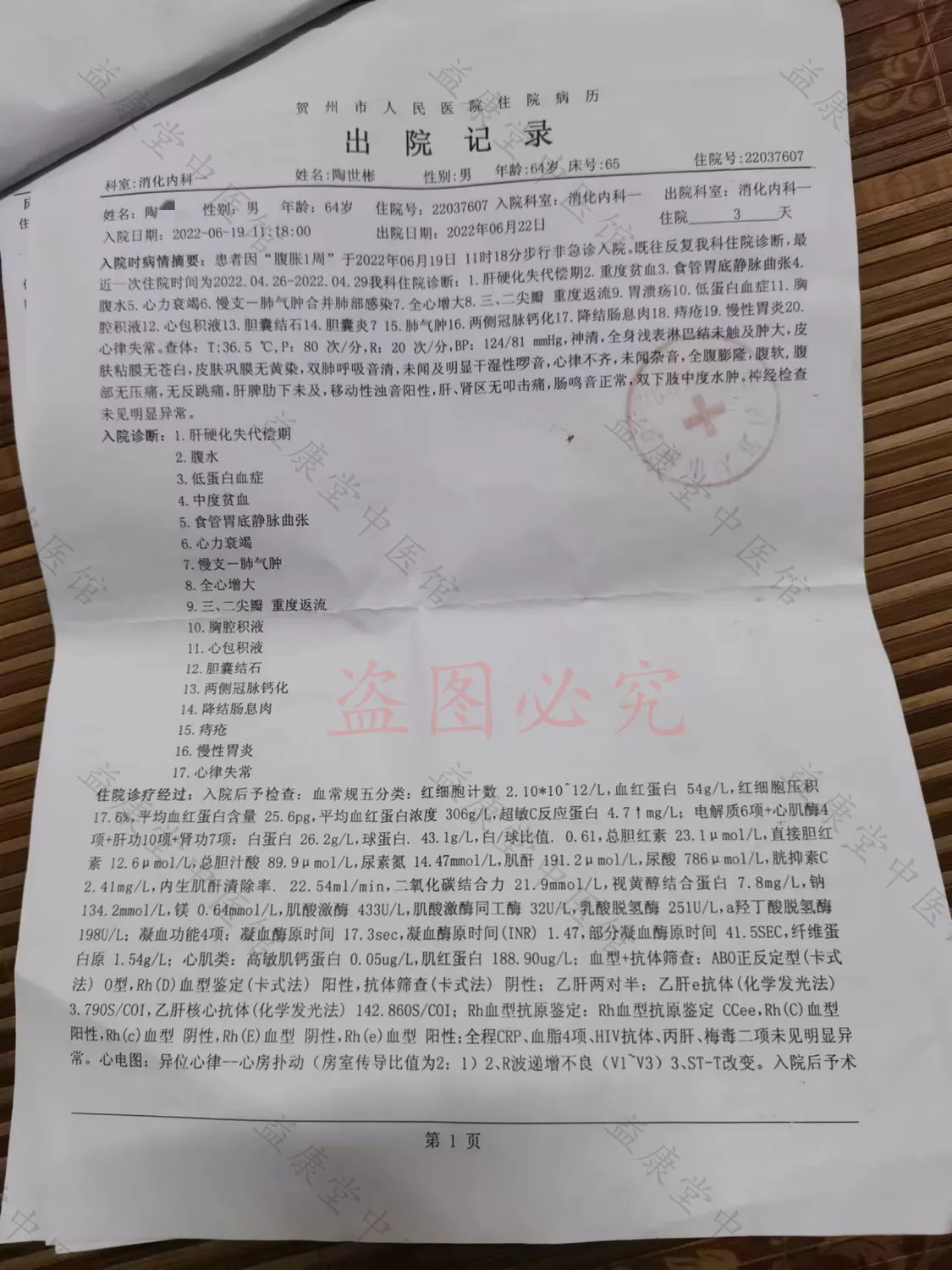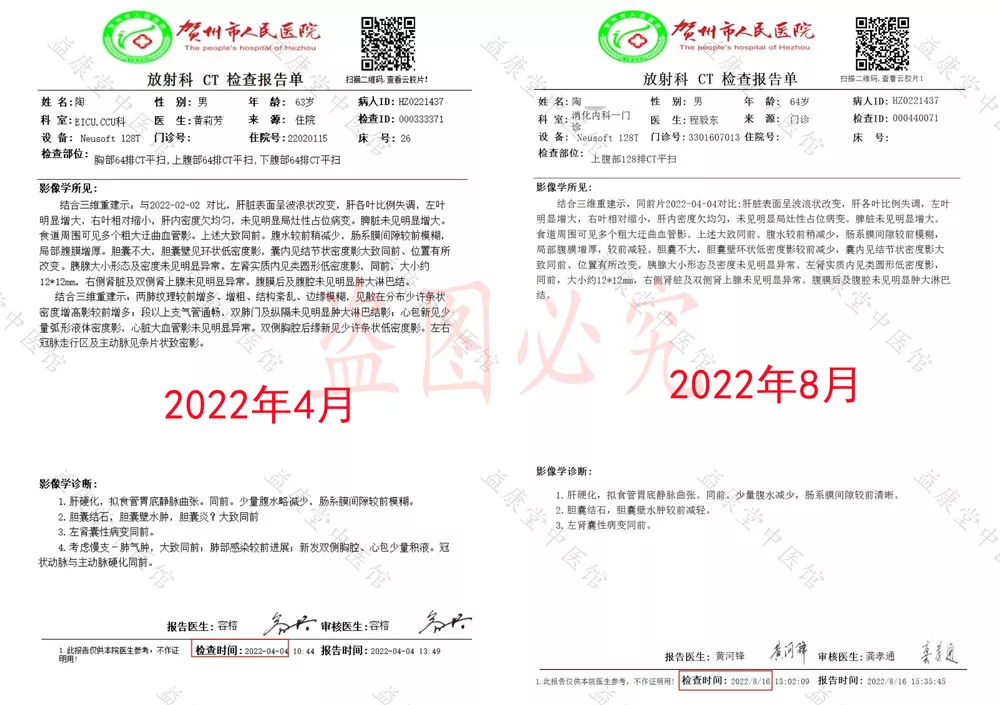 患者通过学习我馆公众号,于2022年6月13日远程求医。根据患者目前状况,经我馆医药人员充分研究,拟定治疗用药方案。使用我馆中草药检查结果明显向好,目前患者食欲睡眠已基本恢复正常,精神面貌明显改观,已无心包积液、腹水。