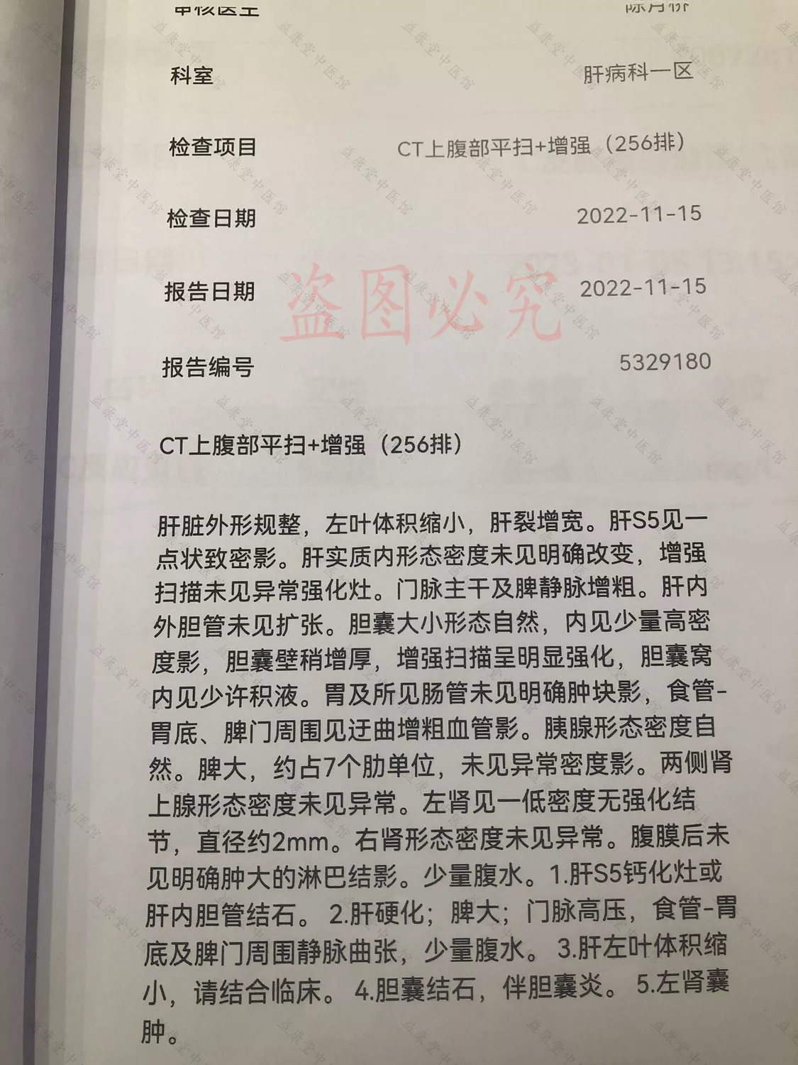 诊断:肝硬化,脾大,门脉高压,食管胃底及脾周围静脉曲张,腹水,肝左叶体积缩小,胆囊结石,胆囊炎,左肾囊肿。
