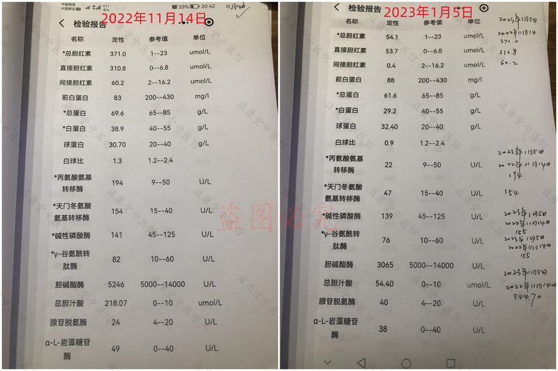 根据患者目前状况,经我馆医药人员充分研究,拟定治疗用药方案,使用我馆中草药40余天,检查结果明显向好,目前指标对比如下: